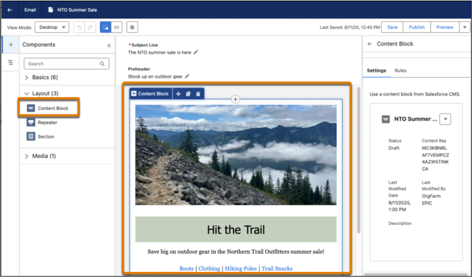 Practical Tip: To deliver a unified, customised campaign across multiple channels while monitoring performance in real time, create an email using reusable content blocks, let the Content Builder Agent edit your subject line, and add interactive WhatsApp elements.
